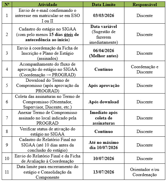 • A matrícula no ESO no SIGAA será formalizada pela PROGRAD somente após a ativação do estágio.